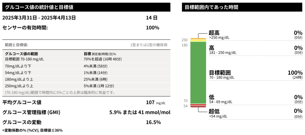 なお、CGMデータの解釈は、少なくとも連続14日間のデータがあり、かつセンサーの稼働時間が70%以上ある場合に、その信頼性が高まるとされています。お手元のレポートを確認する際は、まずこのデータ十分性を満たしているかをご確認ください。