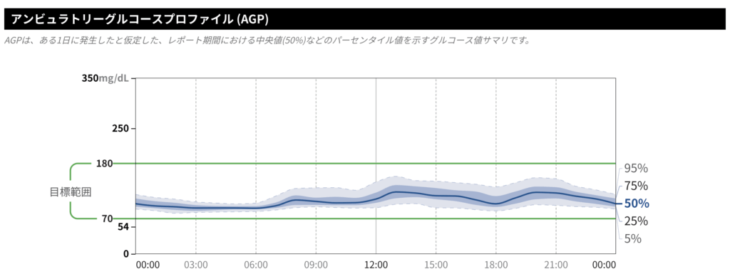次に、レポートの中心に位置する波線グラフ、「アンビュラトリーグルコースプロファイル(AGP)」を見ていきましょう。これは、CGMレポートを読み解く上で最も重要なグラフと言っても過言ではありません。