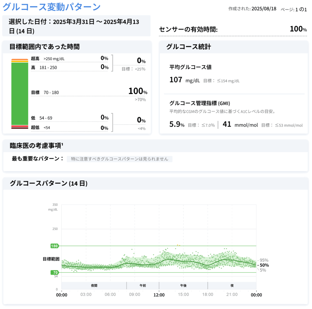レポートによっては、「臨床医の考慮事項」として「特に注意すべきグルコースパターンは見られません」といったコメントが表示されることがあります。これは、夜間に低血糖を繰り返したり、特定の食事の後に決まって激しい血糖値スパイクを起こしたりといった、注意すべき「変動の癖」が見られない、安定した状態であることを示唆します。