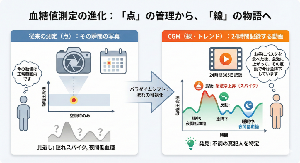 一方でCGMは、24時間365日、あなたが寝ている間も仕事をしている間も、ずっと記録し続ける「動画(線)」です。
