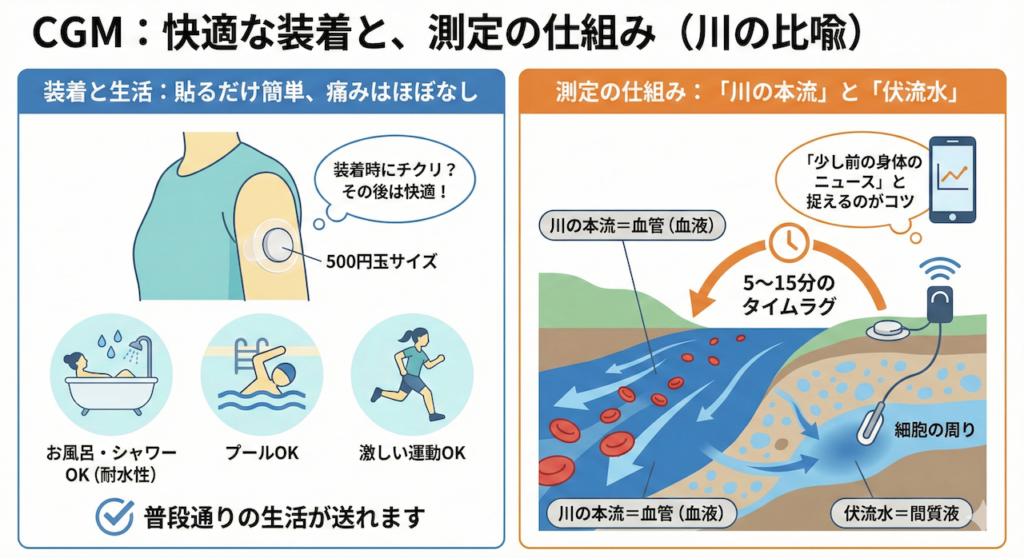 この見えない身体の中の波を、まるで映画のように連続して映し出してくれる技術。それが「CGM(持続血糖測定器)」です。