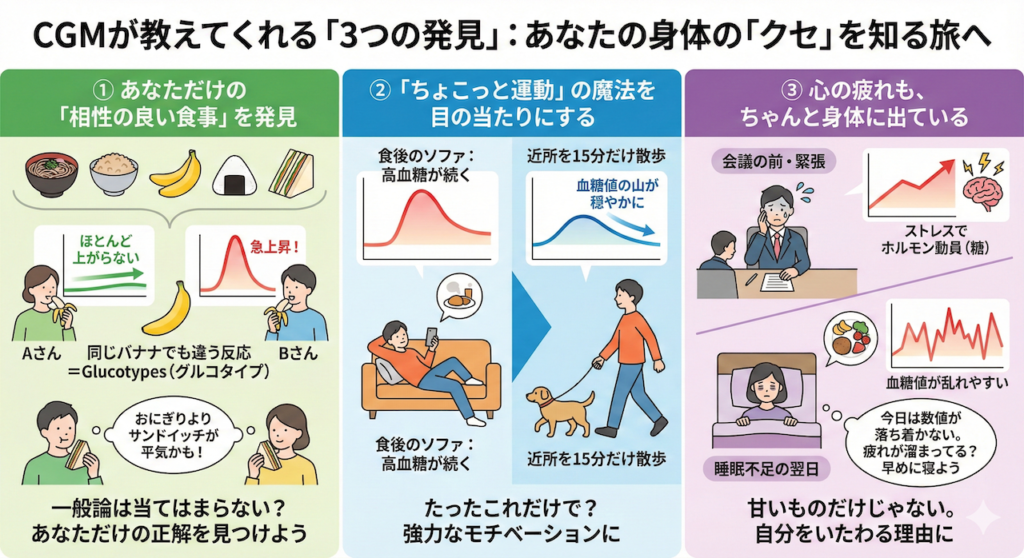 実際にCGMをつけてみると、多くの人が「えっ、私の身体ってこうだったの!?」と驚く発見に出会います。